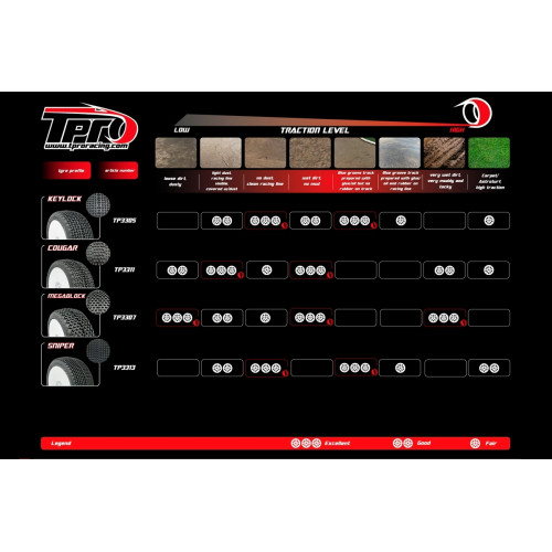 Směs ZR nabízíme v tvrdostech T2-Medium, T3-Soft a T4-Super Soft. Pomocí vhodných přísad je směs ZR k dispozici také v hliněné variantě v tvrdostech C3-Soft a C4-Super Soft. A konečně pro extrémně vlhké a mokré podmínky máme variantu Wet v provedení W5-Ultra Soft. Můžete si tedy vybrat z více než 60 různých pneumatik TPRO. Pro každé použití se tak jistě najde ideální pneumatika.