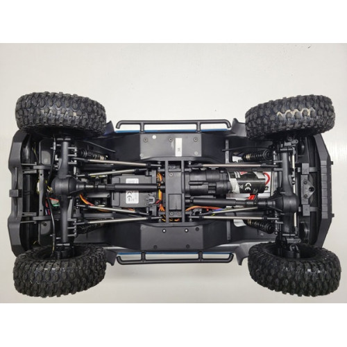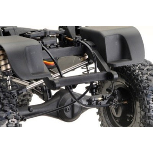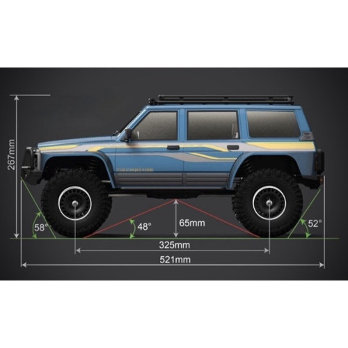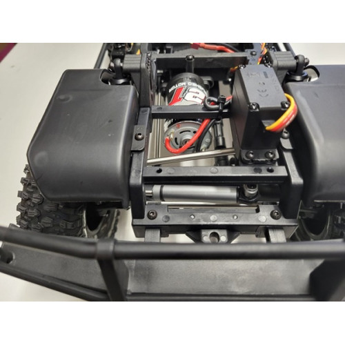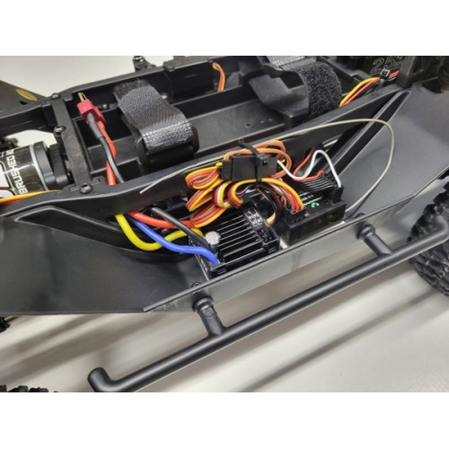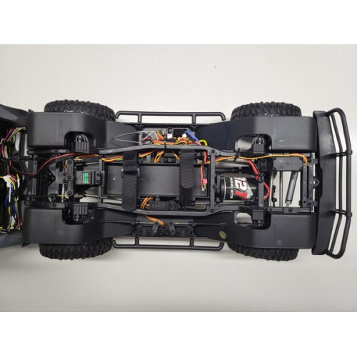 Nová generace expedičního speciálu Absima na podvozku CR4.4 1:10 s excelentními jízdními vlastnostmi. Model má pohon všech kol, je vybaven portálovými nápravami pro maximální průjezdnost terénem. Podvozek má díky novému umístění motru, převodovky a baterie velmi nízké těžiště, což výrazným způsobem vylepšuje jízdní vlastnosti. Dvoustupňová převodovka, uzávěrky diferenciálů, nainstalované LED osvětlení - vše je ovládané z vysílače. Pevný plastový rám s rozvorem 325mm je vybaven plastovými podběhy, které výrazně omezují pronikání nečistot na šasi. Nápravy jsou zavěšené na klasickém 4-linku (kovové linky). Poloosy jsou vybaveny odolnými U klouby, přední kola mají úhel zatočení 45° na každou stranu. Měkké pneumatiky s dezenem typu Hyrax s velkým gripem jsou nalepené na 2.2 plastových diskách. Tlumiče jsou olejové, kovové. Všechny převody jsou kovové (kromě velkého převodového kola u pastorku) a komplet zakrytované. Pastorek s převodovým kolem mají modul M0,6. Silné servo řízení s tahem 25kg s kovovými převody ovládá přední kola přes účinný tlumič řízení, toto řešení výrazně prodlužuje životnost serva a snižuje nároky na jeho výkon (tah). Elektromotor je stejnosměrný typ 550 s velkým točivým momentem. Regulátor je samostatný - Hobbywing WP-1060 60A, BEC 6V/3A s možností nastavení intenzity brzdy v neutrálu otočným ovladačem přímo z vysílače. Konektor na regulátoru je T-Dean. Karosérie je vybavena mnoha maketovými doplňky. Specialitou tohoto modelu je funkce DIG, která při zatáčení v náročném terénu může mechanicky uzavírat/brzdit zadní nápravu a tím výrazně zmenšovat poloměr zatáčení. Na rozdíl od běžných systémů DIG zde nebrzdí obě zadní kola, ale pouze jedno ve vnitřku zatáčky a tím dokáže ještě více snížit poloměr zatáčení a zvýšit manévrovací schopnosti modelu na omezeném prostoru.