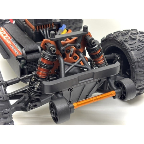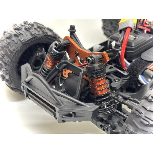 Absima Monster Truck Mini AMT Brushless je malý, ale velmi rychlý obratný monster vhodný do lehčího terénu. Model je velmi kvalitně zpracovaný, pohon všech kol, dva funkční diferenciály. Dále je model plně osazen kuličkovými ložisky, funkčními olejovými tlumiči. Pohon je výkonným střídavým elektromotorem poháněným 3S LiPo baterií. Kardany jsou kovové, přední typu CVD. Vysoká odolnost vůdči stříkající vodě. Servo řízení je třídrátové s kovovými převody, dostatečně dimenzované, vybavené servosaverem. Model je vybaven funkčním LED osvětlením. Maximální rychlost je až 70km/h, na vysílači je možné omezit maximální rychlost modelu. Doba jízdy na jedno nabití je až 20min (záleží na stylu jízdy a na povrchu na kterém se jezdí). Nabíječka je napájená přes USB. Díky vestavěným stabilizátorům a hliníkovému pevnému šasi má model fantastické jízdní vlastnosti i při vysokých rychlostech! Další nadstandardní výbava jsou hliníkové věže tlumičů, ocelové hnací hřídele, nastavitelné závitové tyče zavěšení kol (přední i zadní ) a ochranný rám podvozku, vše již nainstalováno z výroby. Součástí balení jsou i zadní opěrná kolečka zabraňující převrácení modelu vzad při prudké akceleraci.