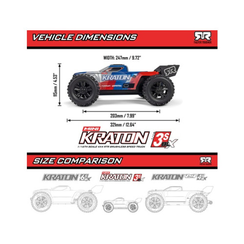 RC model Arrma Mini Kraton 3S je zkonstruován jako ryzí Basher, tedy model hlavně pro maximální zábavu při volné jízdě v jakémkoliv prostředí. Pro tuto jízdu je skvěle připraven - má odolné šasi, náhon 4x4, nezávislé zavěšení, 3 diferenciály a střídavý motor s ohromujícím výkonem. Můžete s ním jezdit na nižší trávě v parku, užít si divokou jízdu v terénu s odlétající šotolinou, nebo třeba skákat na skokáncích. Díky technologii Powerguard umožňuje model všestranné použití pro začátečníky i zkušené jezdce, od pomalejší, ale zato delší jízdy (30 km/h, 30 min) až po neskutečnou rychlost přes 80 km/h. S platformou Mini, s menšími kompaktními rozměry, si navíc můžete model vzít snadno s sebou do batohu a jezdit tak na různých místech. Vše potřebné je v balení, včetně akumulátoru 3S LiPo a USB-C nabíječe.